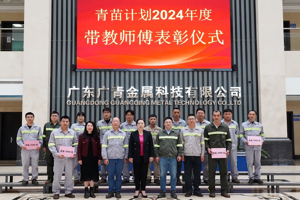 1月7日,广东广青金属科技有限公司青苗计划2024年度带教师傅表彰仪式在公司一楼会议室举行。公司党委副书记、工会主席王大庆,党委委员、副总经理杨洋,相关厂部负责人以及青苗计划师徒代表参加此次仪式。