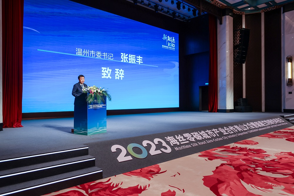 张振丰书记发表讲话。他指出:近年来温州在产业发展的新赛道上积极抢占新能源“风口”,形成清洁能源“全链条”布局、先进制造“集群化”成链、创新平台“高能级”支撑的良好态势,希望大家在共享温州山海之美中,携手展望零碳城市的美好前景,同时期待更多优秀企业和人才来温州,与温州这座城市共同成长、彼此成就。