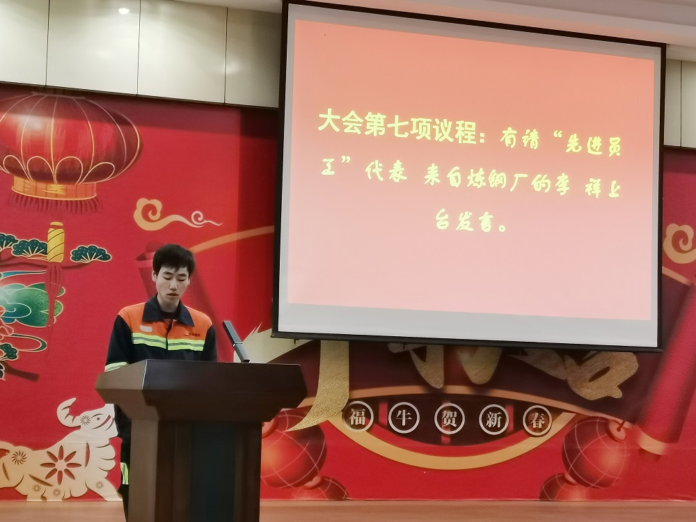 先进集体代表镍铁部二期脱硫除尘班组的王红军、炼钢部先进员工代表李祥进行发言。王红军表示:获得先进集体的荣誉,离不开脱硫除尘班组每位成员的努力,经过技改调试,员工解决了生产工艺不成熟给调试带来的各项难题,不断改进脱硫工艺,脱硫效率有了明显提高;今后脱硫除尘班组将把荣誉作为新的起点,不骄不躁,做到在线数据无超标,保障生产事故向零迈进。