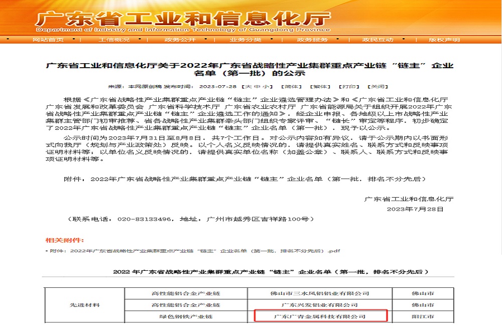 近日,广东省工业和信息化厅公布2022年广东省战略性产业集群重点产业链“链主”企业名单(第一批),广东广青金属科技有限公司成功入选广东省战略性支柱产业集群先进材料领域绿色钢铁产业链“链主”企业。